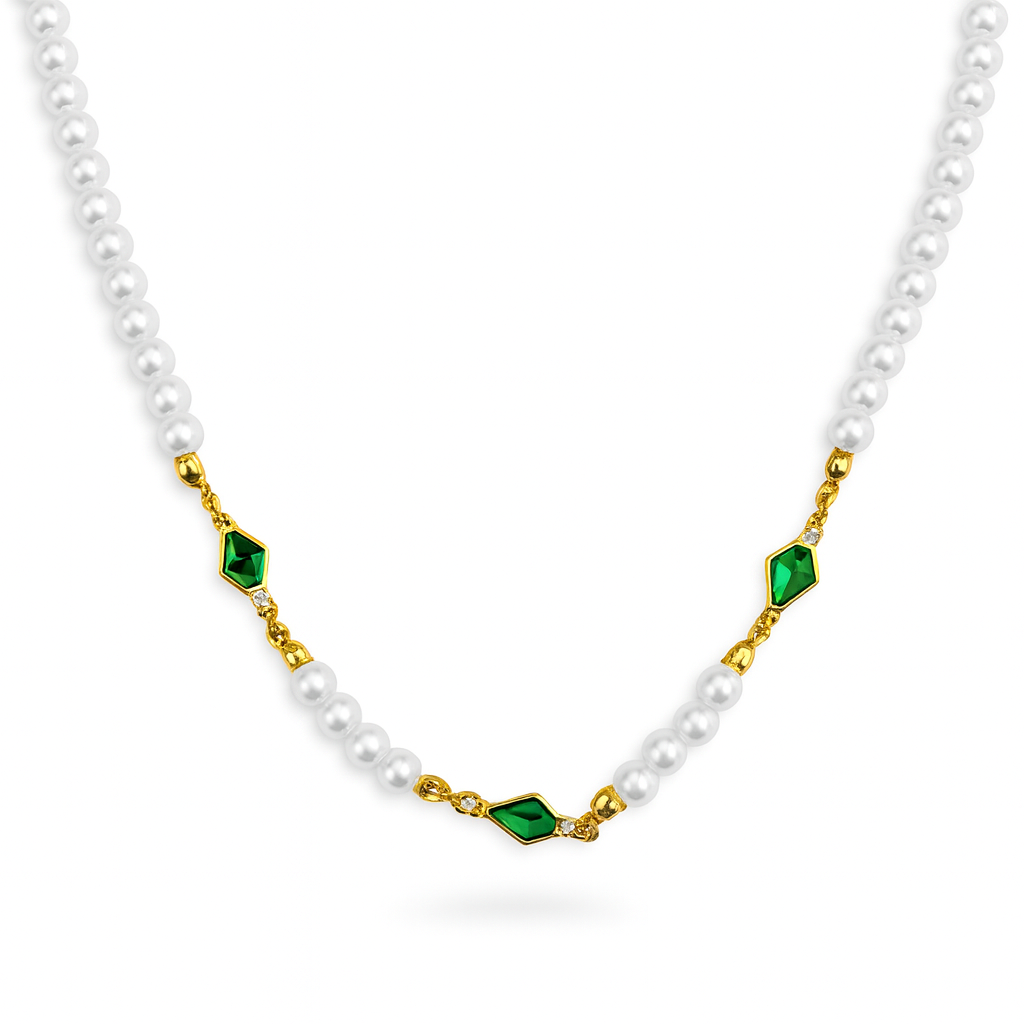 Un diseño que reinterpreta lo clásico. Perlas blancas combinadas con cristales verde esmeralda y detalles dorados, creando una pieza elegante y contemporánea para elevar cualquier look.