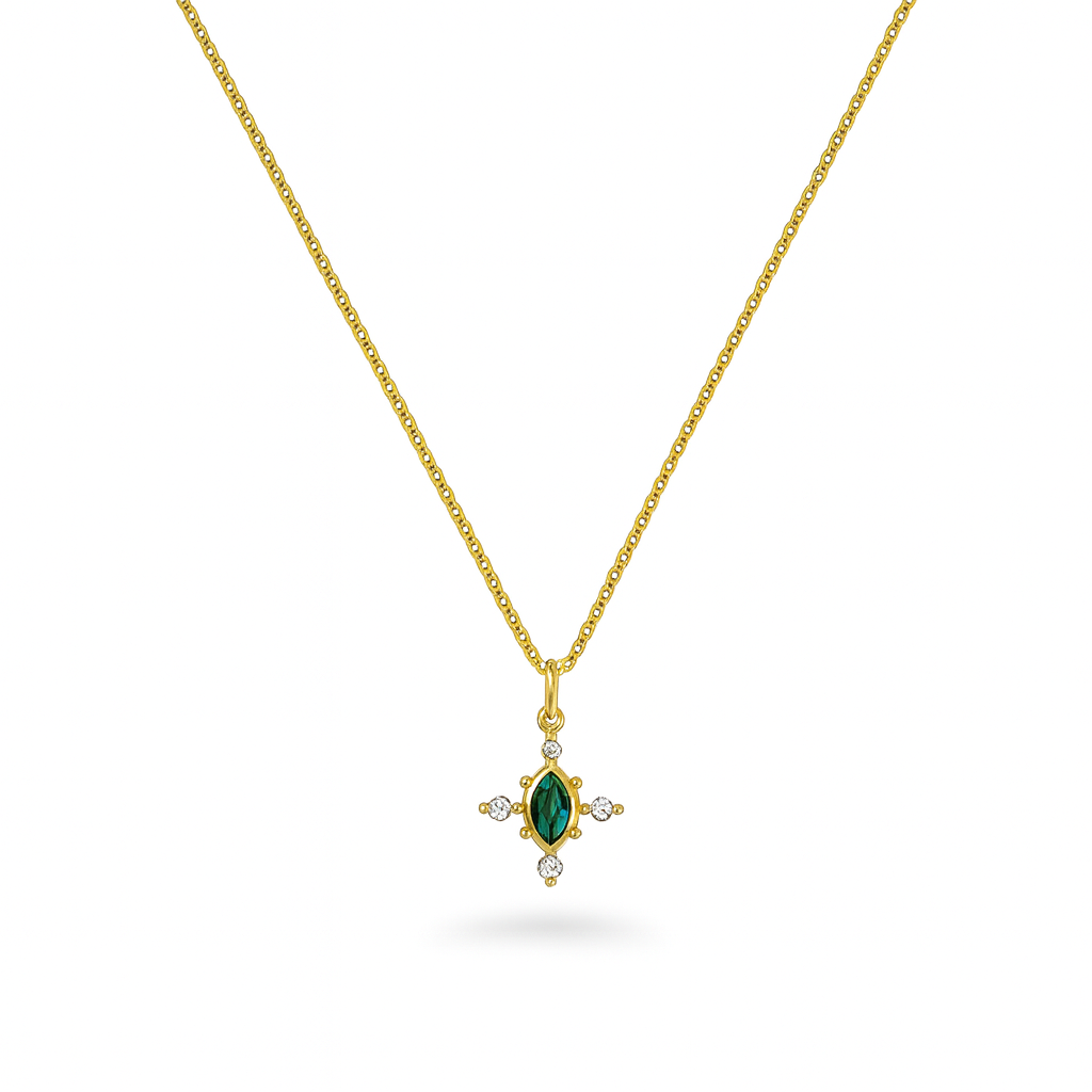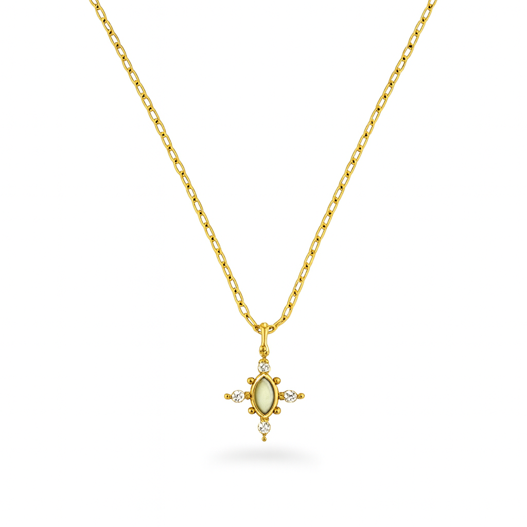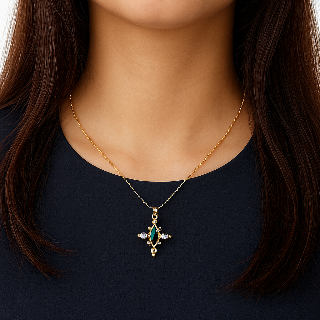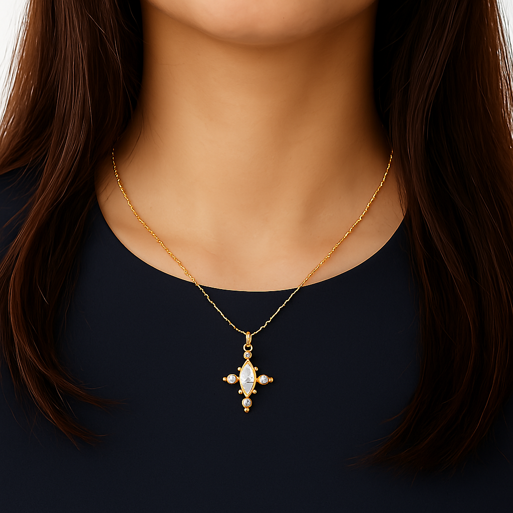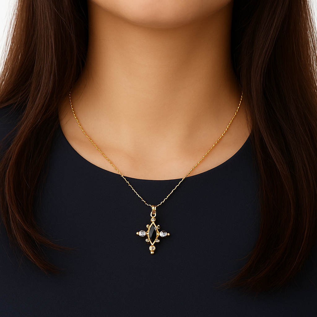Su dije con piedra al centro y destellos alrededor aporta brillo sutil y personalidad.